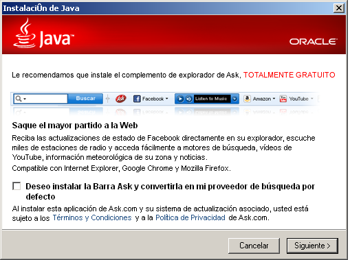 3- En la siguiente ventana, deseleccionamos la opción de instalar la Barra Ask y le damos a "Siguiente".